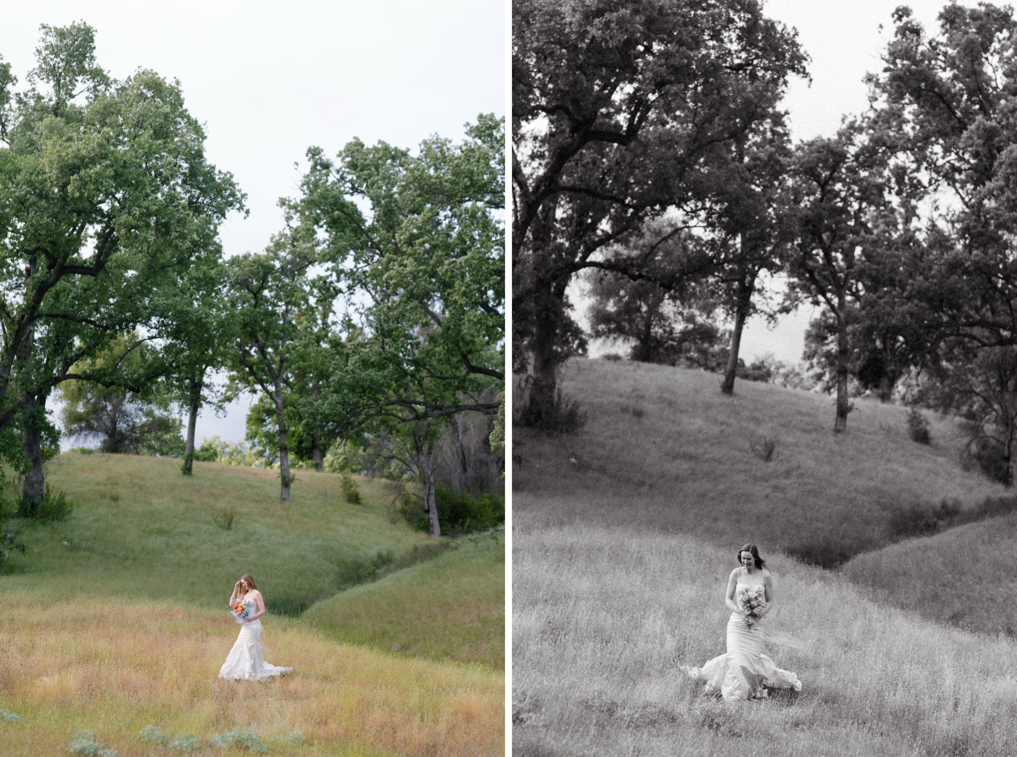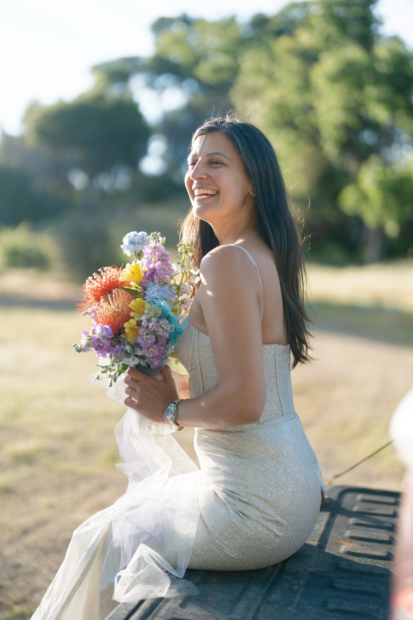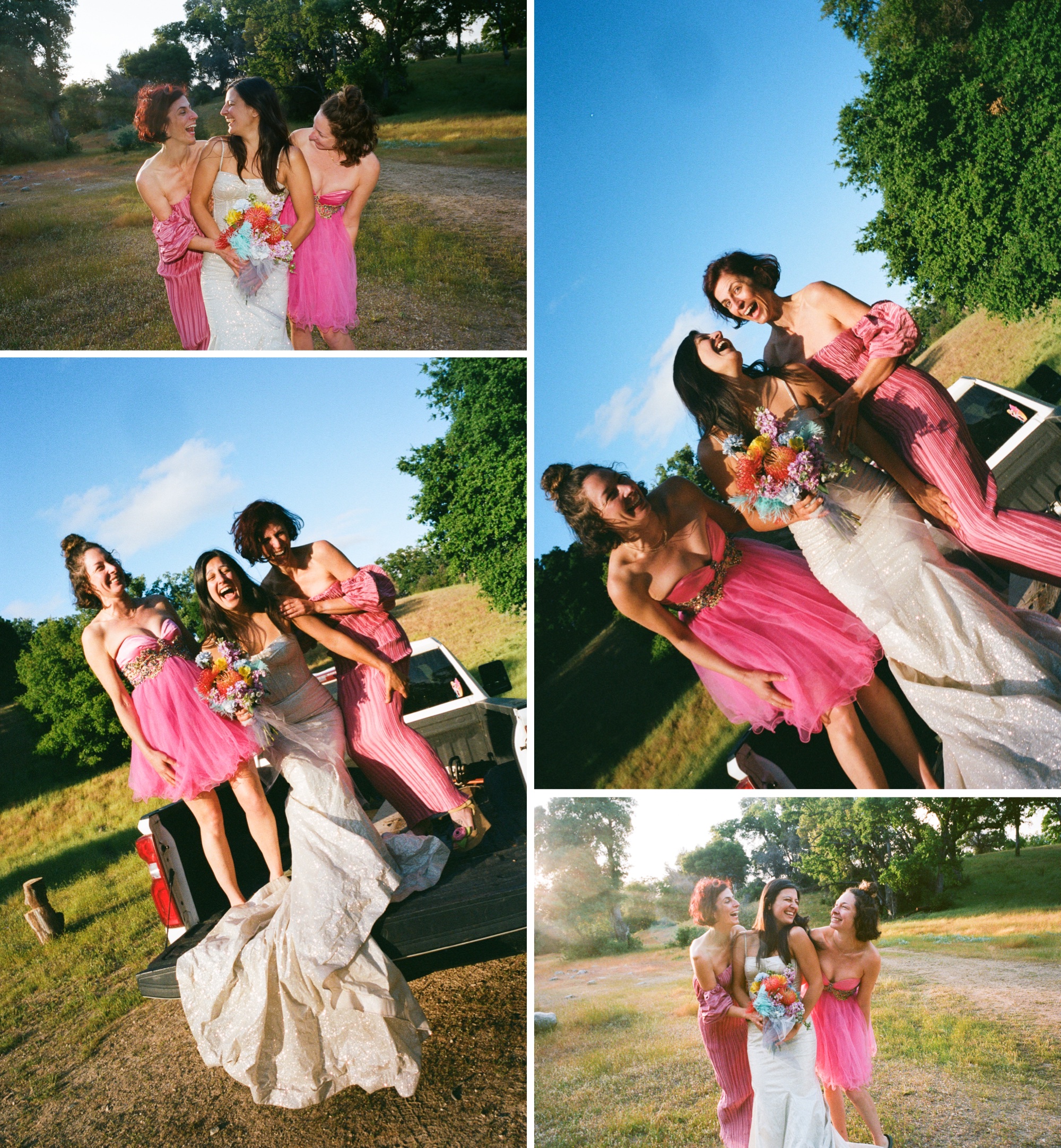 But why limit ourselves to just one epic location? The adventure continued as we collaborated again with some more adventurous ladies, this time in the rolling oak hills east of Big Sur along California’s stunning coastline. The lush, golden hillsides provided the perfect contrast to the rugged reds of Utah, showcasing the versatility and timeless beauty of the AW Bridal dresses. Coastal California, with its gentle, golden landscapes and sun-kissed grasses dancing in the breeze, brought out a softer, romantic side of the Minerva Wedding Dress. It was as if the gown itself could belong effortlessly to both worlds—equally at home amid desert cliffs or coastal breezes. (But of course, we had to add in some tailgate giggles and princess-pink tulle in there, too.) We had a blast from beginning to end.